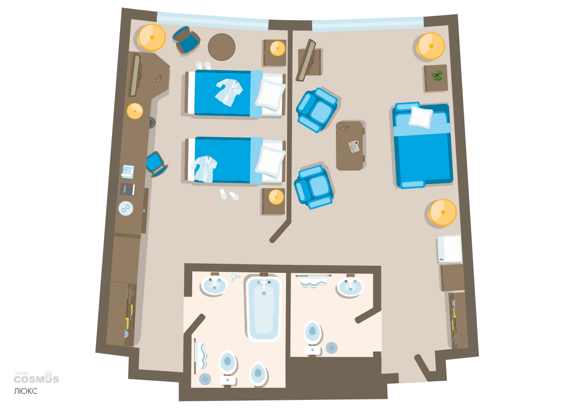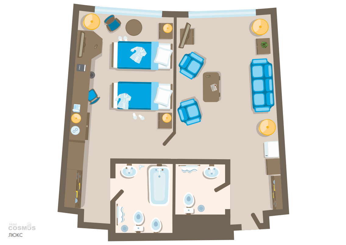 Номер «Люкс» состоит из двух раздельных комнат – гостиной и спальни, ванной комнаты и гостевого туалета. Площадь номера – 46 кв. м. Размеры дверных проемов: входной проем: высота 200 см, ширина 74 см. Проем в санузел: высота 200 см, ширина 58 см.