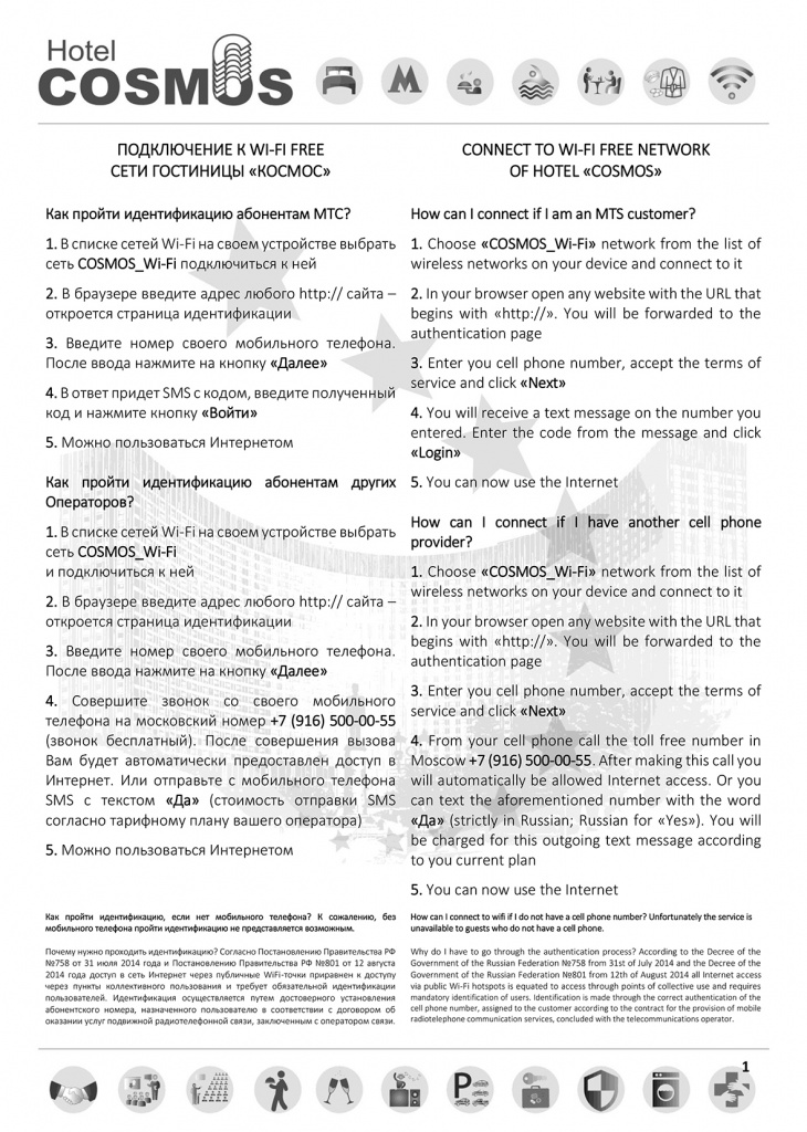 Теперь вам не нужно бежать по каждому поводу в интернет-кафе. Московская гостиница «Космос» 24 часа в сутки предоставляется вам полностью бесплатный Wi-Fi, без всяких ограничений. Вы спокойно проверяете почту, отправляете и получаете фотографии, смотрите в Интернете видео и узнаете погоду в любом городе. При этом можете находиться как в номере, так и в других точках гостиничного комплекса.